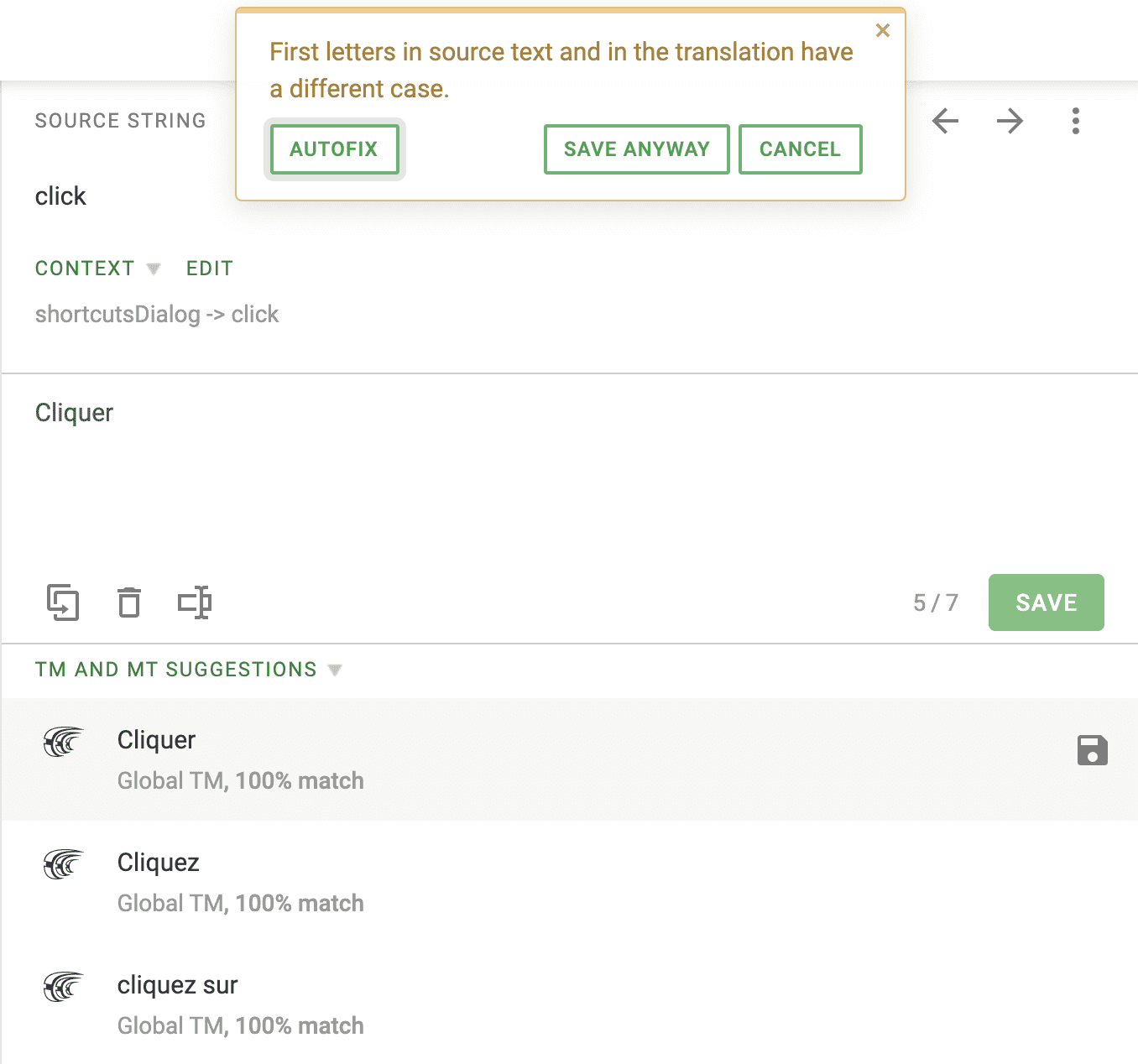 Where Crowdin really excels is in the translator experience. For every string, it offers many translation suggestions. In practice the workflow is to chose a string to translate, scroll through the suggestions and click on one that works and repeat. Crowdin also has cool features like capitalization warnings.